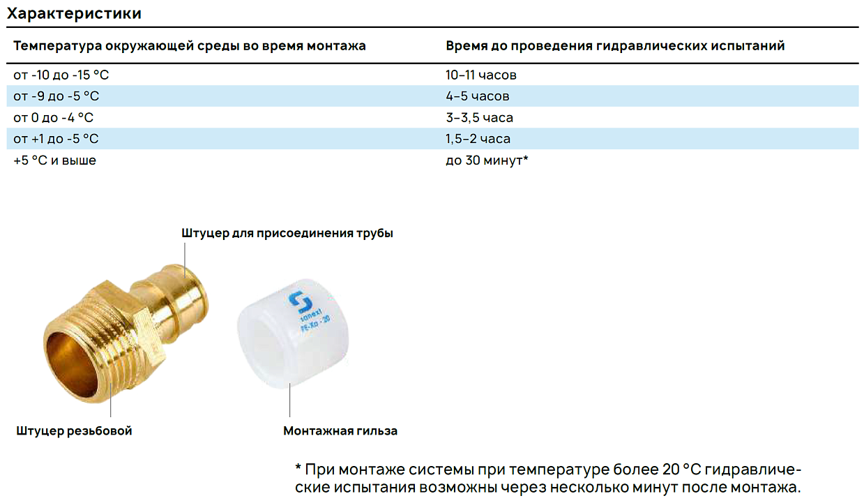 сопротивления, которые не требуется учитывать в гидравлическом расчете системы. Для ускорения процесса восстановления формы гильзы и обжатия фитинга трубой в случае монтажа при температурах ниже +5 °С возможен нагрев соединения горячим воздухом (температура обдува – не выше 80 °С). Гидравлические испытания соединений следует проводить через промежуток времени в зависимости от температуры окружающей среды.
