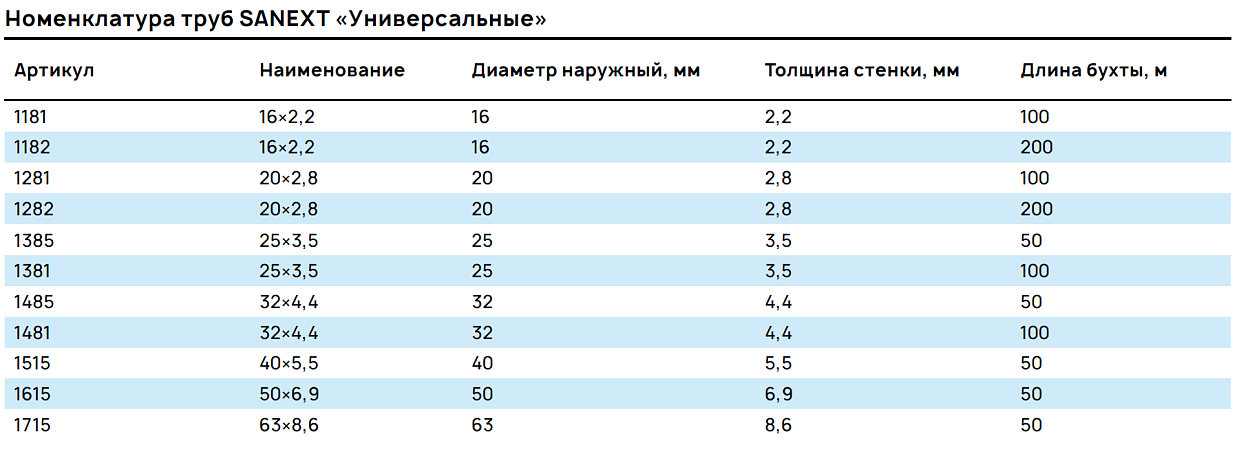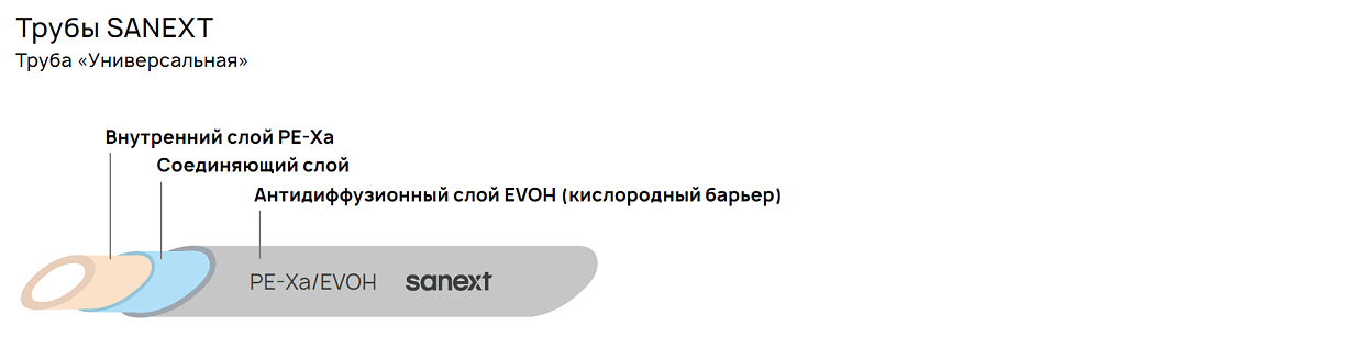 Труба SANEXT «Универсальная» предназначена для использования в системах водяного отопления, а также горячего и холодного (в т. ч. питьевого) водоснабжения. Труба изготавливается из полиэтилена PE-Xa, сшитого пероксидным