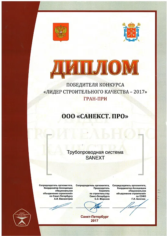 САНЕКТ.ПРО стал победителем конкурса «Лидер строительного качества-2017». 2 вида продукции были отмечены наградами конкурса: Трубопроводная система SANEXT – ГРАН ПРИ и РКУ SANEXT Этажный - диплом 2-й степени в номинации «Производство строительных материалов и конструкций. Инженерные системы».