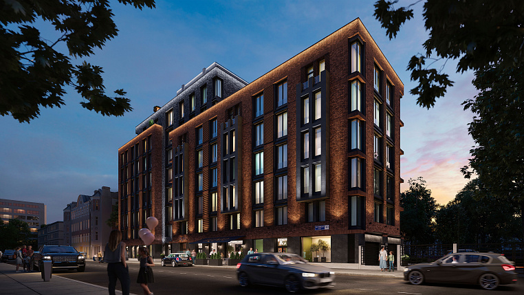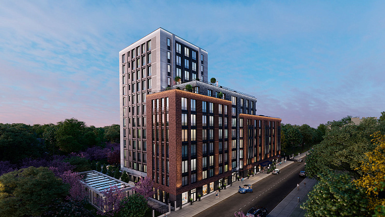 Дом визуально разделен на две части разной этажности с большими светлыми окнами, террасами и французскими балконами.