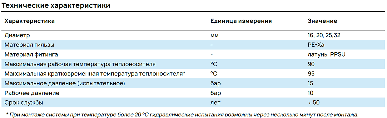 При длительном воздействии солнечных лучей гильза из сшитого полиэтилена утрачивает прочностные характеристики. Соединение трубы с фитингами не требует дополнительного уплотнения (уплотнителем является материал трубы). Фиксирующие буртики на штуцере имеют острые края, благодаря чему труба надежно уплотняется. В процессе монтажа труба экспандируется (расширяется) специальным инструментом, что позволяет избежать заужения диаметра фитингов. Места соединений имеют незначительные местные
