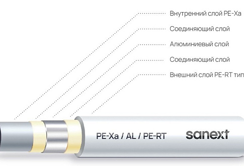 Трубы SANEXT «Стабил» состоят из основного внутреннего слоя сшитого полиэтилена натурального цвета (прозрачный), слоя алюминия, и наружного слоя сшитого полиэтилена белого цвета. Между слоев располагается соединяющий полимерный слой.