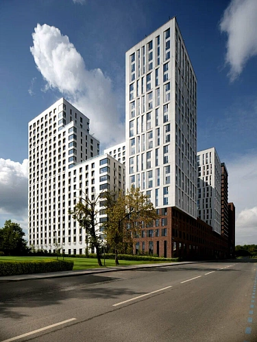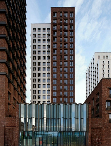 Комплекс отличает нестандартная пластичная архитектура: клинкерный кирпич и алюминиевые панели, игра света и тени, сочетание разных материалов, цветов и фактур. Проект включает лучшие решения в концепции лофтов — от высоких потолков и больших окон до свободных планировок и углового остекления.