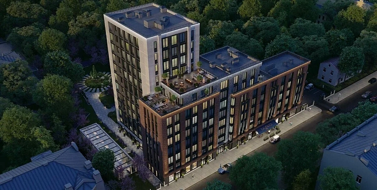 Дом визуально разделен на две части разной этажности с большими светлыми окнами, террасами и французскими балконами.